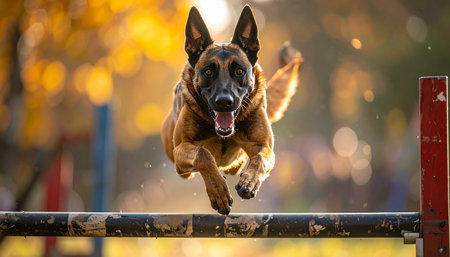 A powerful Belgian Malinois, a picture of focus and athleticism, soars effortlessly through the air. Captured in mid-jump over an agility hurdle, its muscular form is highlighted against a soft, autumnal background, embodying concepts of peak performance, dedication, and achieving goals.
