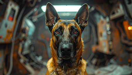 A loyal German Shepherd sits attentively in the high-tech cockpit of a spaceship, a steadfast companion on an interstellar journey. This conceptual image evokes themes of adventure, futuristic exploration, and the unbreakable bond between animals and humans across the galaxy.