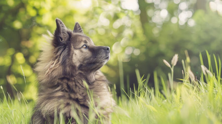 A dog is sitting in the green grass with its head tilted, gazing upwards. The dogs ears are perked up and its eyes are focused on something above. The scene captures a moment of curiosity and alertness in the canines behavior.