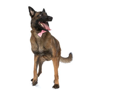 excited malinois puppy wearing pink bowtie, looking up and jumping while sticking out tongue and panting in front of white background in studio