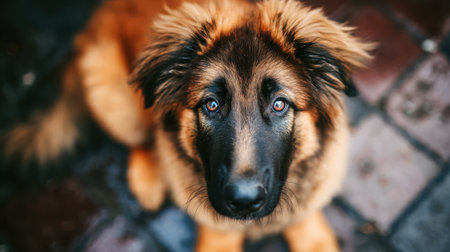 A German Shepherd puppy with a fluffy coat and dark muzzle gaze upwards, its blue eyes full of curiosity.