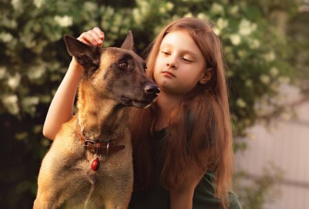 Cute kid girl petting the belgian shepherd dog with love on summer green grass background. Closeup portrait