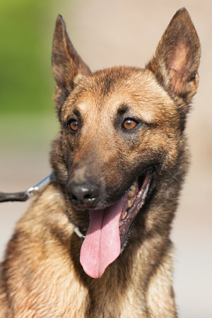 Portrait of Belgian Malinois dog , long ears and brown hair, open mouth, pink tongue, white teeth, blurry green background, summer day in a park