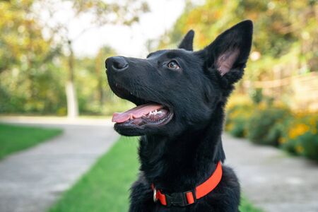 Portrait of young German shepherd outdoors. Curious puppy is looking up