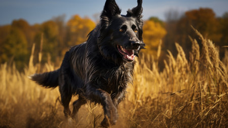 a dog with dark fur and no spots is seen running through a tilled wisconsin field in this dramatic, sharp-focused photograph. the medium-sized dog has a side profile close-up, with its entire body centered on the screen frame. the image is beautifully color-graded and showcases extreme details, giving it a hyper-detailed and cinematic feel. ai generated