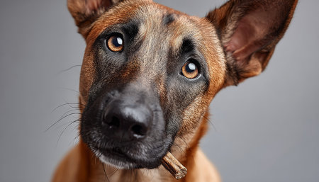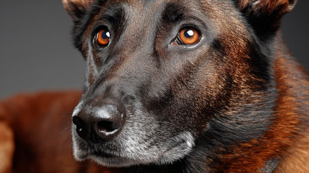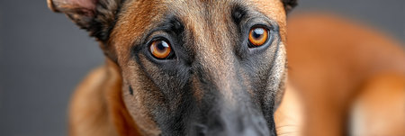 Stunning Close Up Portrait of a Belgian Malinois with Expressive Amber Eyes on Soft Gray Background