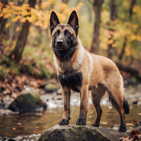 German shepherd dog standing in a stream in autumn forest. Selective focus.