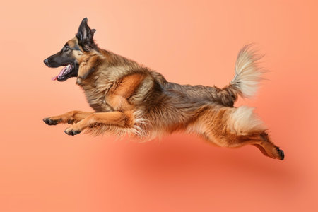 Belgian Tervuren dog Jumping and remaining in mid-air, studio lighting, isolated on pastel background, stock photographic style