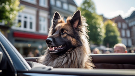 An AI generated illustration of a friendly Tervuren with long fur seated in the driver's seat of a car