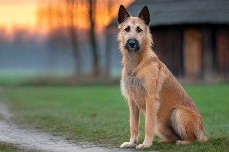 Portrait of a beautiful Dutch shepherd dog sitting on the grass in front of a wooden house at sunset