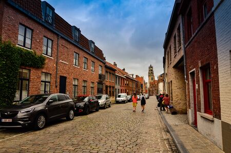 Bruges, flanders belgium. August 2019. Approaching the historic center, the medieval aspect emerges: cobbled streets, low red brick houses.