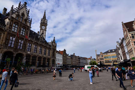 Ghent, Belgium, August 2019. Magnificent buildings overlook the streets of the historic center. People on the street.