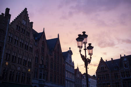 Silhouettes of city center houses in Bruges against beautiful sunset, Belgium