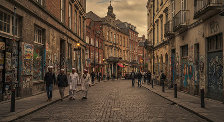 Ghent Belgium - April 15 : People walking in a cobble stoned street in Ghent, Belgium, Europe