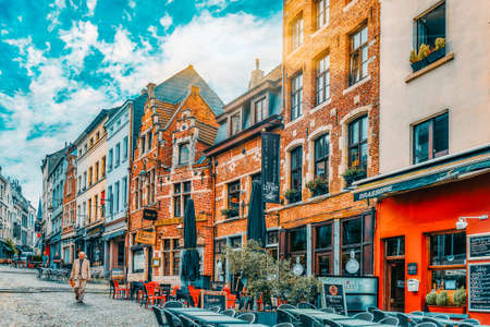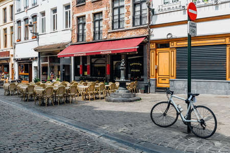 Old street with tables of cafe in center of Brussels, Belgium. Cozy cityscape of Brussels (Bruxelles). Architecture and landmarks of Brussels.