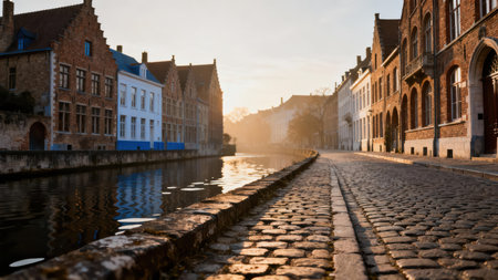 Textured foreground of gray cobblestones and stone retaining wall directs attention toward the atmospheric sunlight filtering through traditional Flemish-style canal houses at dawn.