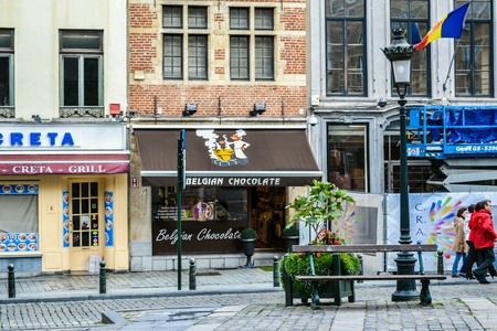 Street view of old downtown with lots of people walking at the street of Brussels, Belgium.