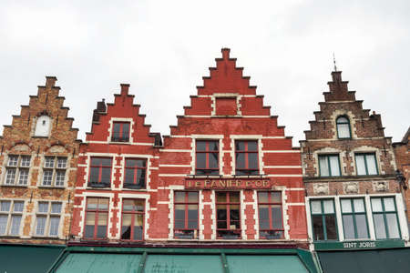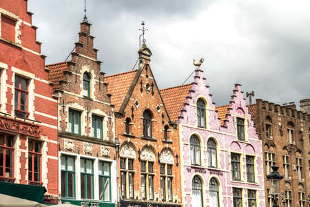 Famous old colorful buildings at Market square in Bruges, Belgium. Popular Flemish city with almost intact medieval architecture.