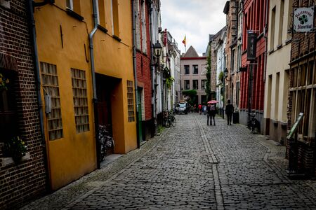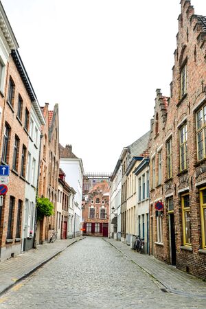 Typical street in the historical part of Bruges with small colored houses in the Flemish style, cozy cafes, restaurants and shops, Belgium