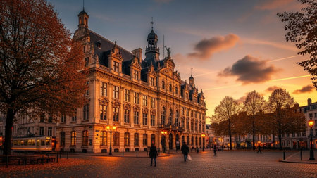 View of the town hall at sunset.