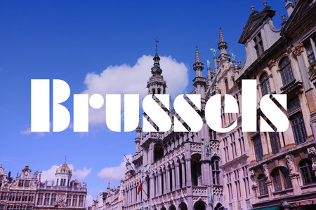 Brussels, Belgium. City name modern photo postcard. Travel destination text word title card.