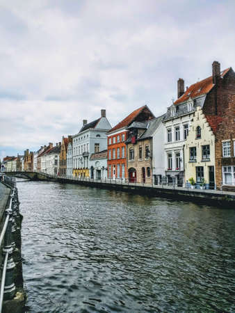 Beautiful landscape on classic houses in the Flemish style with reflection in the water of canals in the historical center of Bruges, Belgium
