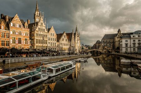 Ghent, Belgium - Oct 6, 2018. View of Ghent cityscape with Leie River. Ghent is the Belgium most beautiful city, rich in history, and attracting tourists.