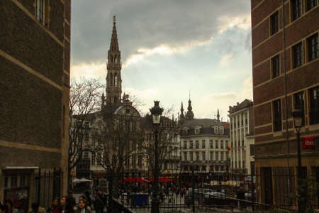 Brussels, Belgium; 04 28 2016. Place d'Espagne (English: Spanish Square) and the tower of the Town Hall in the distance. Urban scene on a dark, cold and cloudy spring day.
