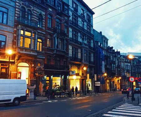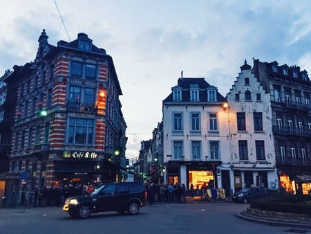 Brussels, Belgium circa January, 2020: Streets of Brussels, the capital city of Belgium, european architecture and historical buildings at night