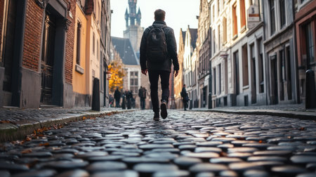 A pedestrian walking on a cobblestone track in a historic city, showcasing cultural heritage and urban exploration.