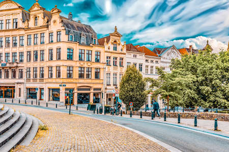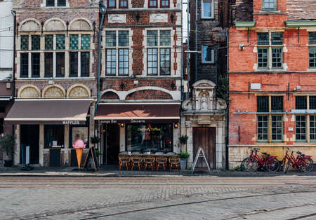 Old street with tables of cafe in Ghent (Gent), Belgium. Architecture and landmark of Ghent. Cozy cityscape of Ghent.