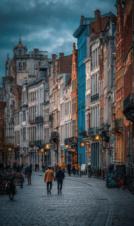 A street scene depicts old buildings in various colors and styles. People are walking on a cobblestone road. The composition includes vertical lines of buildings against a cloudy sky. The lighting suggests dusk or twilight. This image may be suitable for architectural, travel, or editorial projects.