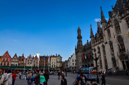 Bruges, Belgium. August 2019. The market square is one of the main squares in the historic center: the most beautiful buildings overlook it. A lot of people attend it is a must.