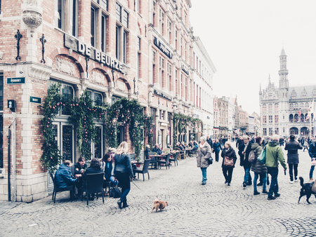 Bruges, Belgium; 04 28 2016. Tourists and locals in restaurants of Walplein Square in Bruges. Picturesque photo of a restaurant terrace between the facades of traditional houses.