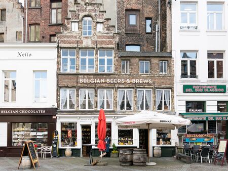 Gift shops in historic houses at Handschoenmarkt in the city centre of Antwerp, Flanders, Belgium