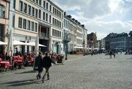 Mons / Belgium / May 7 2012 : The town square in the heart of the old city. Elegant buildings surround the open, cobbled, space. Tables and chairs at cafes lining the place.