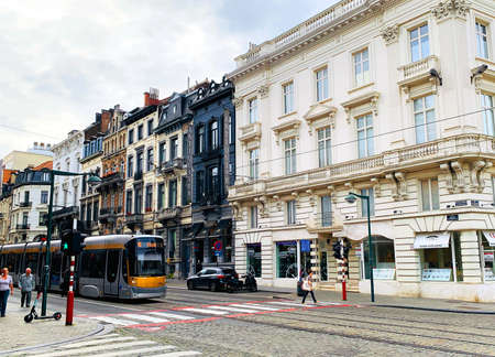 Brussels / Belgium - July 9, 2019: Cityscape of Brussels - European Union Capital. Petit Sablon. New tram crossing pedestrian passage.