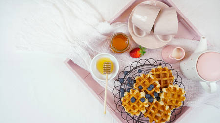 Modern blush pink breakfast tray with waffles, honey and fruit with copy space.