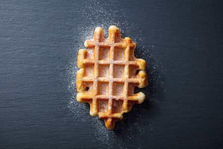 Homemade Belgian waffle on a plate. With powder sugar on it. Top view