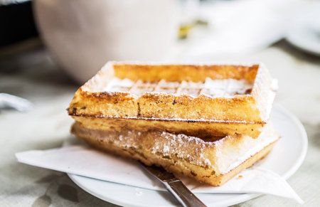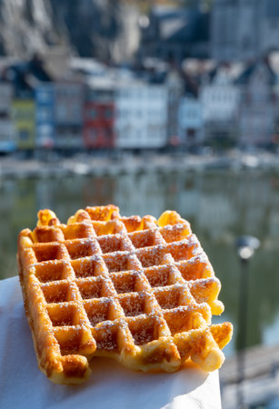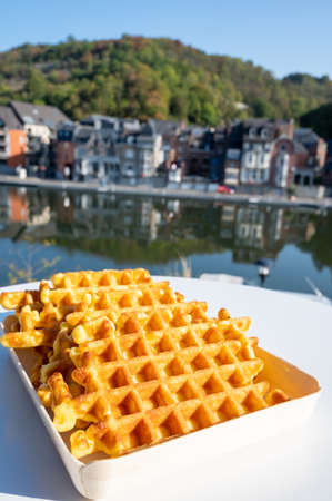 Sweet fresh baked Belgian waffles served outdoor with view on Maas river in Dinant, Wallonia, Belgium close up