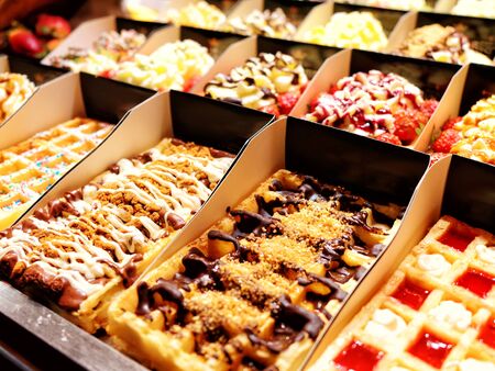 Belgian waffles with colorful sweet toppings and fruits for sale in Brussels, Belgium