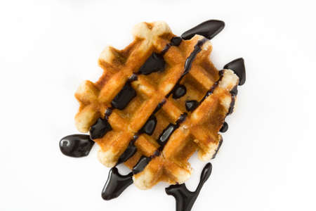 Belgian waffles with chocolate syrup isolated on white background. Top view