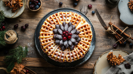 Overhead shot of a round waffle cake decorated with dark cream rosettes, powdered sugar, and red berries on a rustic wooden table with festive winter elements