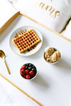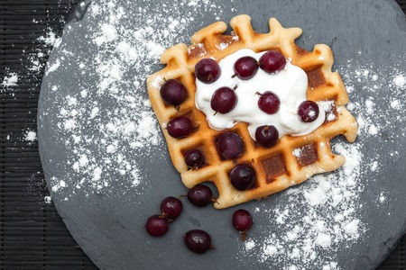 Viennese waffles with jam on a white plate. Delicious sweet breakfast with waffle.