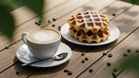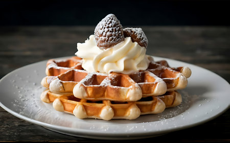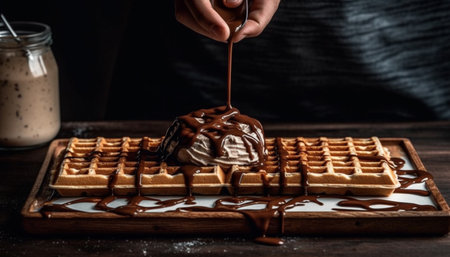 freshly baked waffles on a rustic wooden table, created with generative ai