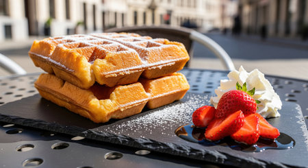 Belgian waffles with fresh strawberry and cream served on a table at an outdoor street cafe. Delicious breakfast on a sunny day.