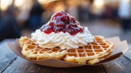 Close-up of crispy Swedish waffles with jam and whipped cream served on a paper plate at a street food market, showcasing rich textures and colors.