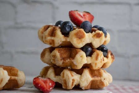 Stack of Belgian waffles, blueberry, strawberry cuts, mint leaf, sugar powder