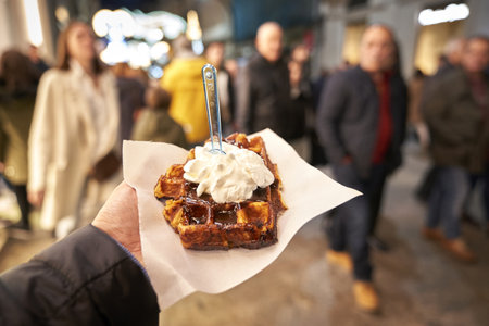 Traveler enjoys famous local street delicacy - Belgian delectable waffle drizzled with rich chocolate sauce amidst the bustling tourist streets of Bruges, Belgium, Europe. Classic sweet treat from Belgium.