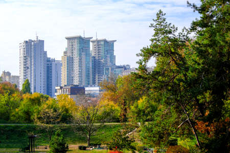 View of the residential area of the city of Kiev near the botanical garden on an autumn cloudy day